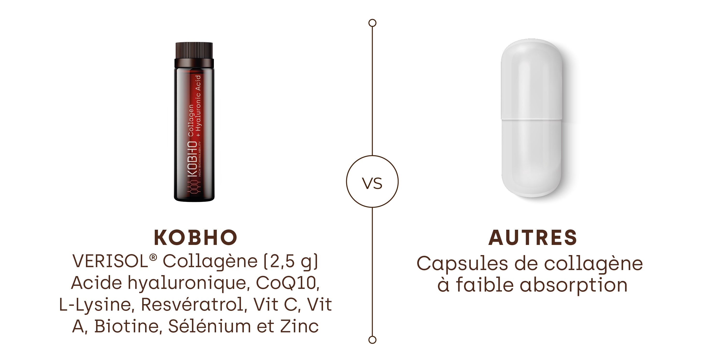 Le corps ne peut pas absorber le collagène sous sa forme complète. C'est pourquoi la formule de Kobho Labs fournit du collagène sous forme hydrolysée et sous forme liquide pour en faciliter l'absorption, assurant une biodisponibilité maximale.