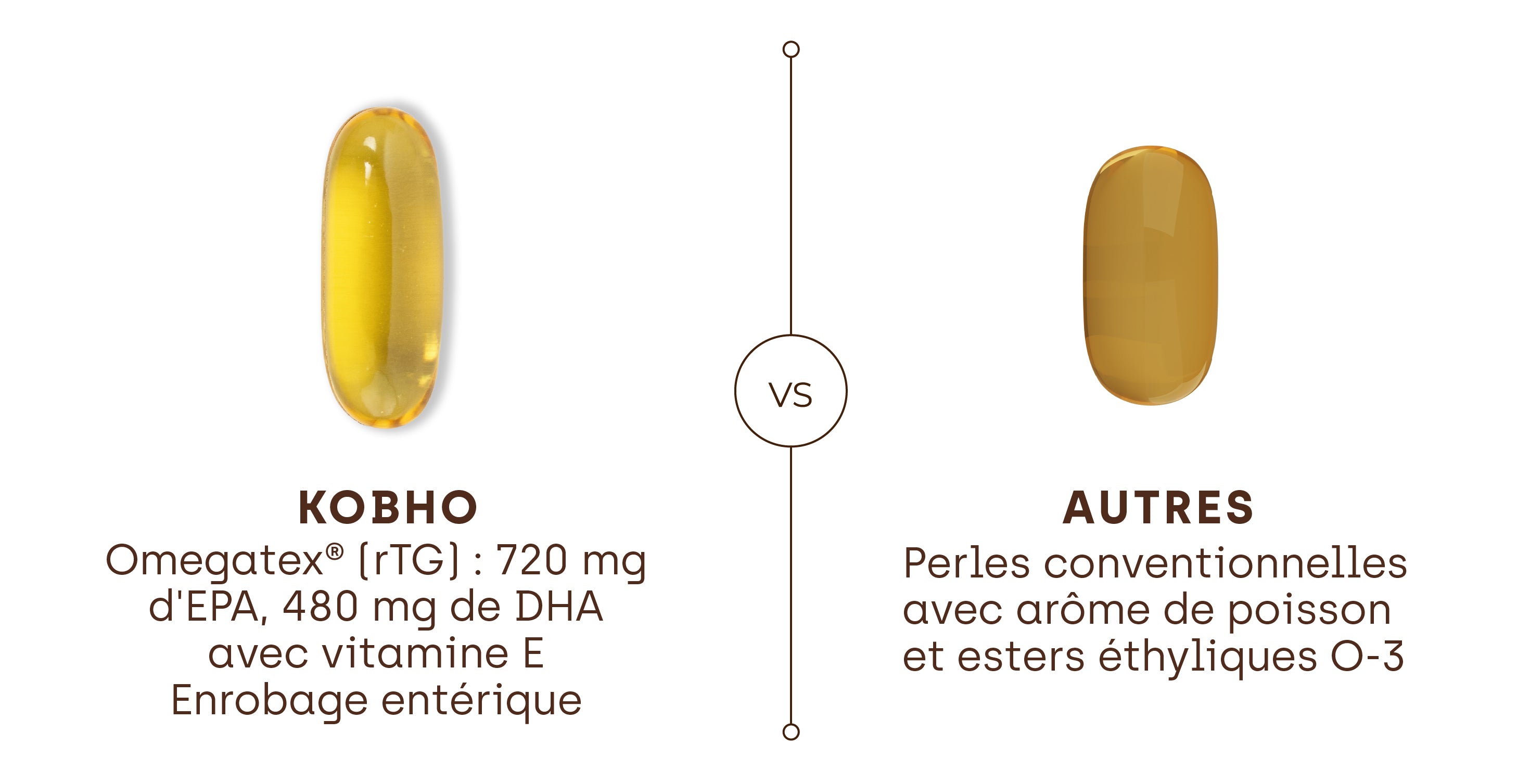 Nous utilisons une huile de poisson de grande pureté, qui contient de l'oméga-3 sous forme de triglycérides réestérifiés (rTG), une forme beaucoup plus biodisponible que d'autres sur le marché, comme l’ester éthylique. De plus, l'enrobage entérique de nos perles permet une meilleure libération sur le site d'action et dissimule le goût de poisson.