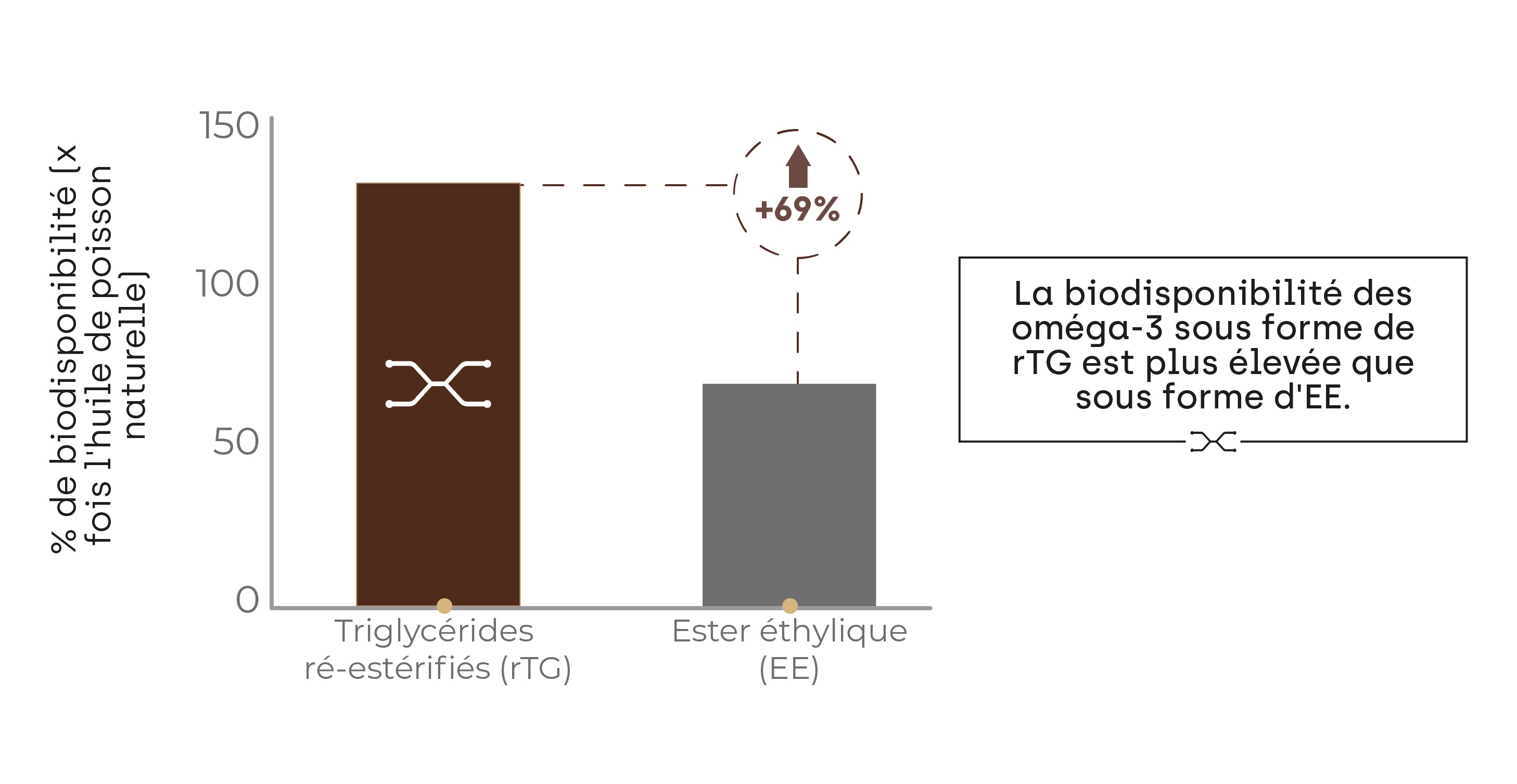 Nous avons sélectionné les acides gras oméga-3 sous forme de triglycérides réestérifiés (rTG) car c’est leur forme la plus biodisponible. En particulier, les oméga-3 sous forme de rTG sont absorbés 69 % mieux que sous forme d’éthyl ester (EE), qui est la forme habituelle dans les suppléments. Cela permet d’augmenter leur biodisponibilité.
