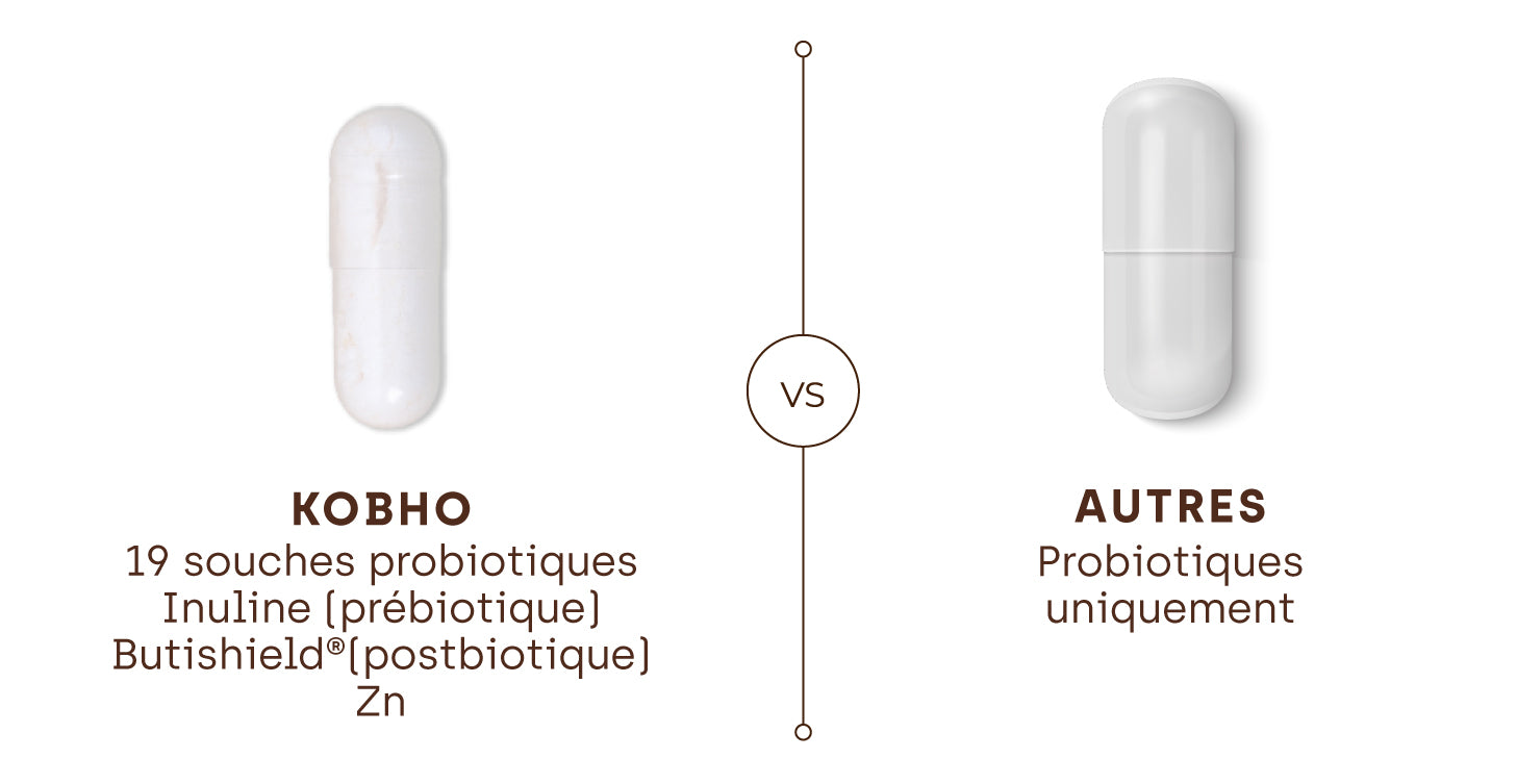 La formule symbiotique de Kobho associe l'inuline (prébiotique) à 19 souches probiotiques et au butyrate de calcium ButiShield™ (postbiotique).